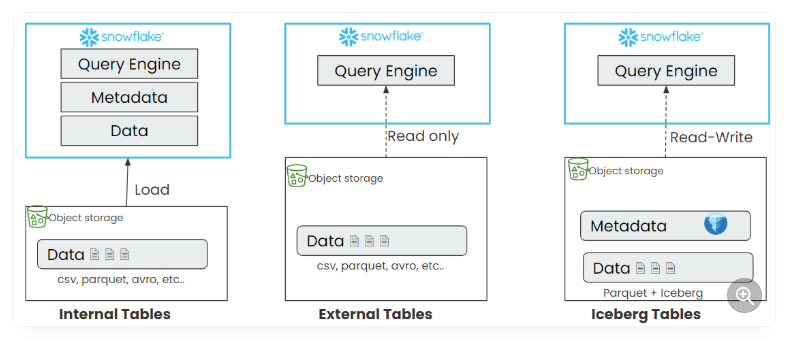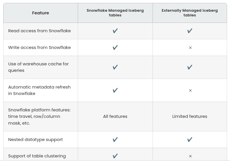 Depending on where the catalog is managed for Iceberg tables, Snowflake can have two types of Iceberg tables: